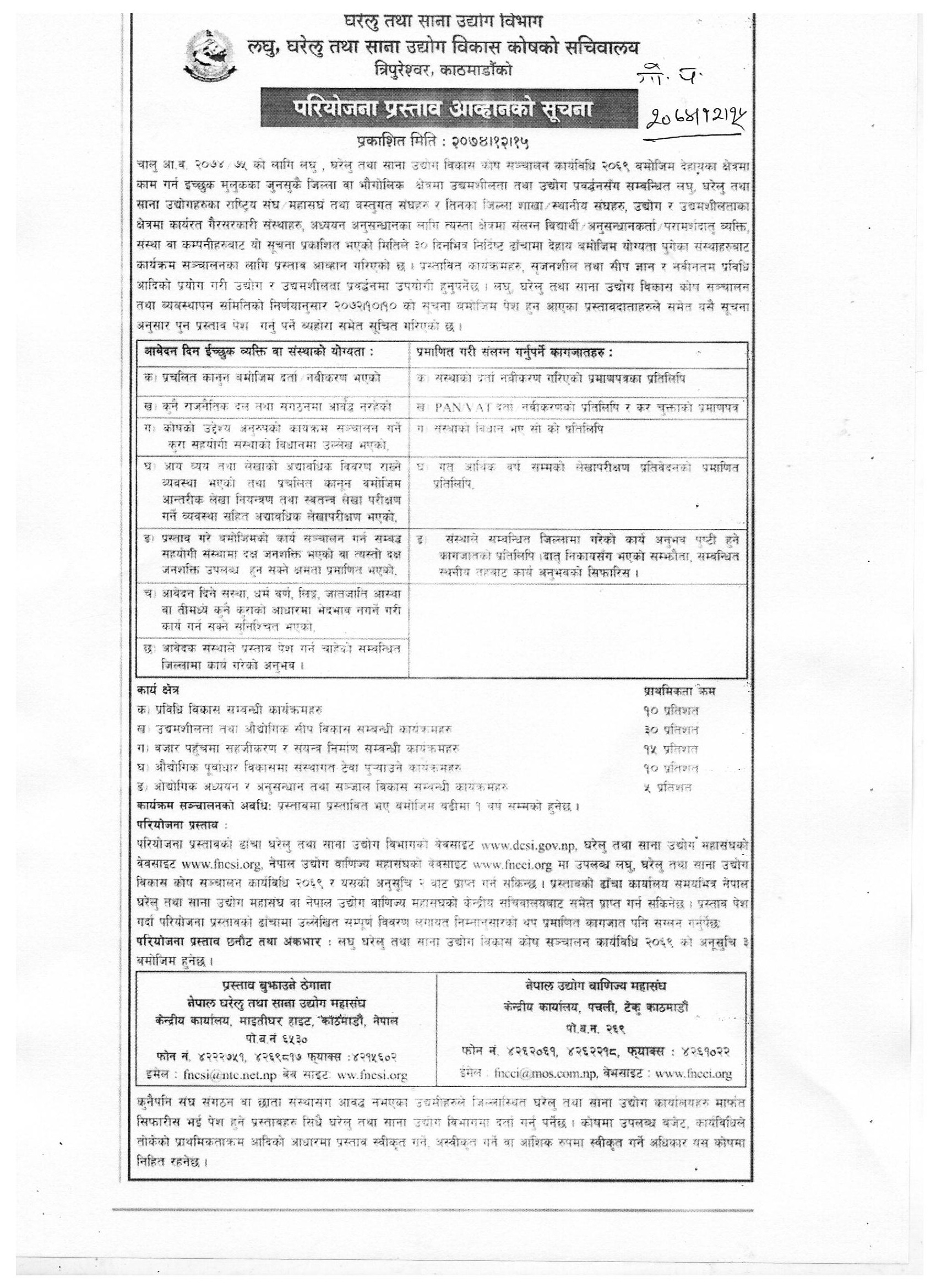 Circular on Implementing Ministry Decision 2074/08/03 Allotment of Branch Offices of RBB for Loan Disbursement under Women Entre. Devt. Fund 2074/05/09 Call for Inclusion in Standing List 2074/04/08 Ammendment to the Circular for the Handover of Office of Cottage and Small Industries to Local Level 2074/04/01 Circular for Reporting Progress of Loan Mobilization in Women Entrepreneurship Development Fund 2074/04/03 Announcement of Loan Awarded for FY 2073/74 under Women Entrepreneurship Development Fund 2074/03/18 Circular for the Handover of Office of Cottage and Small Industries to Local Level 2074/03/15 Paripatra 2017-03-06 AboutTechnology Transferring 2017-01-24 TOR for TPE(Third party Evaluation ) of MEDPA 2016-11-18 Details will be provided information about the earthquake damage 2016-02-23