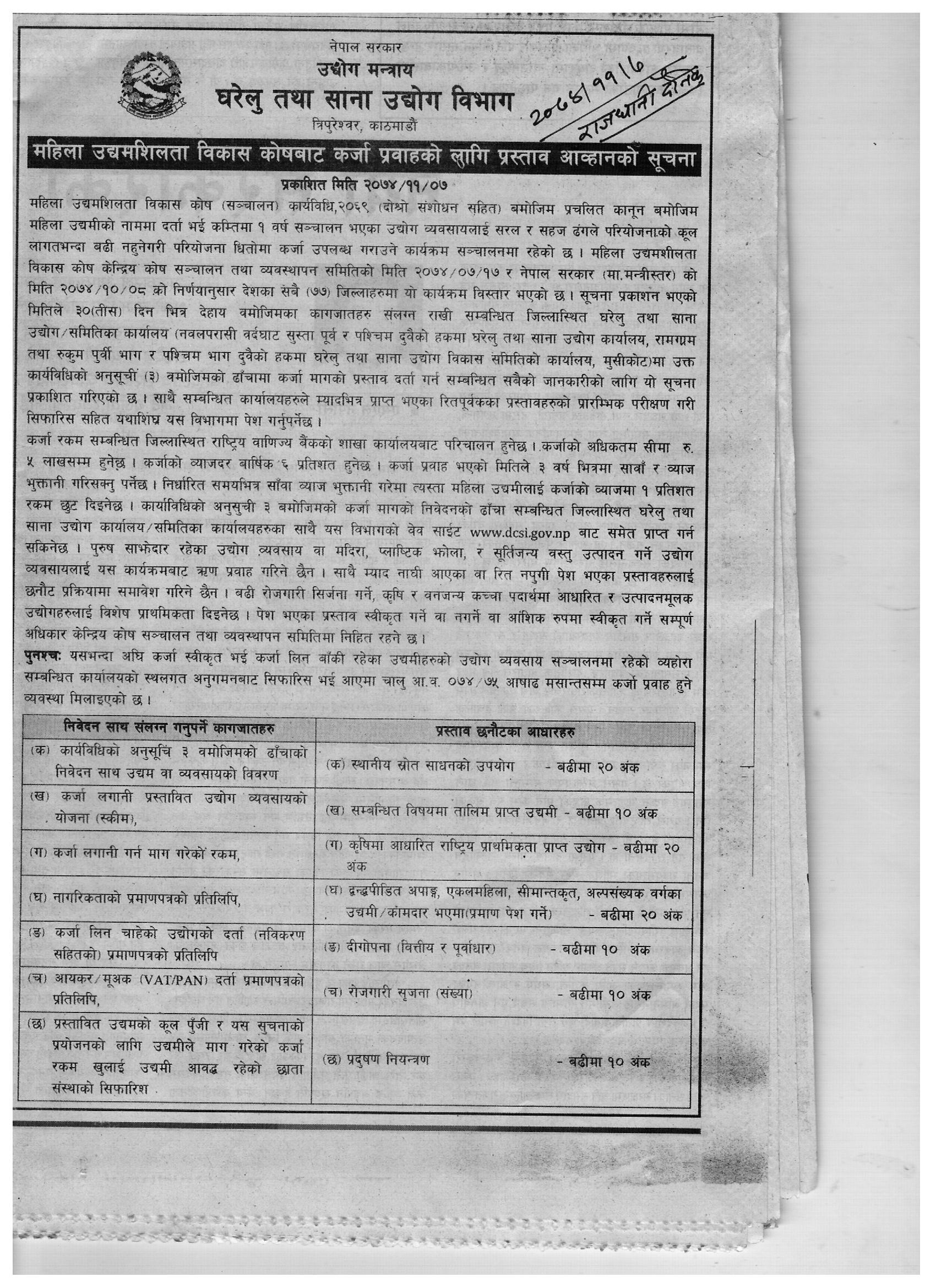 महिला उद्दमशिलता विकास कोषबाट कर्जा प्रवाहको लागि सम्बन्धित छाता संस्थाको सिफारिस सहित अनुसूचि ३ को ढाँचामा प्रस्ताव आव्हान गरिएको सुचना