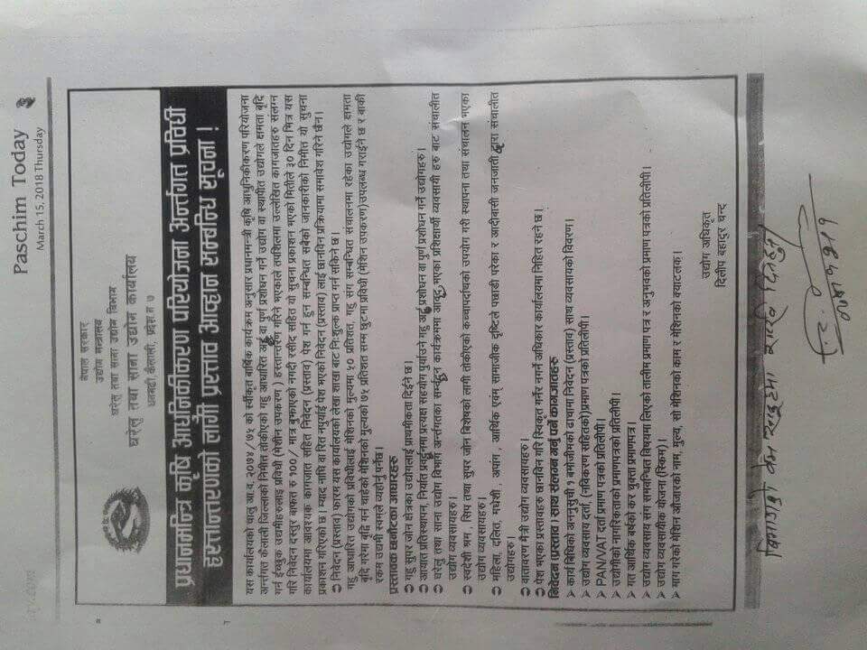 प्रधानमन्त्री कृषि आदुनिकिकरण परियोजना अन्तर्गत प्रविधि हस्तान्तरण सम्बन्धी घरेलु तथा साना उद्दयोग कार्यालय, कैलालीको सुचना